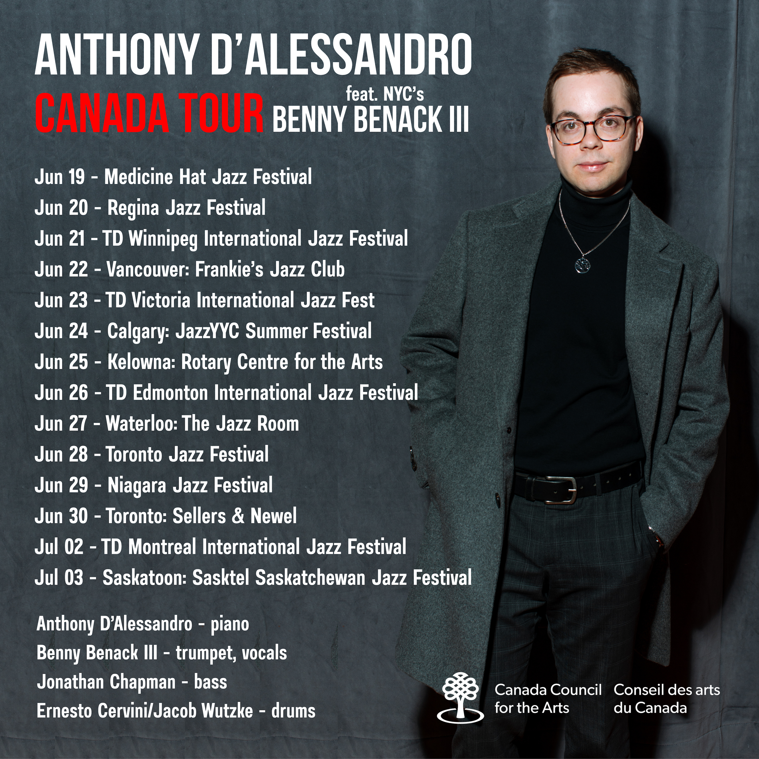 15 concerts. 15 days. 13 cities. 6 provinces. 2 masterclasses. 11 jazz festivals. 15 excellent audiences. 8 fully sold out venues. The Anthony D’Alessandro Quartet feat. Benny Benack III’s summer 2025 Canadian National Jazz Festival tour was a great success! Thank you to all who made this happen!